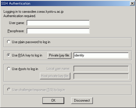 | SSH Authentication | SSHでの設定です。 Password方式の場合には、「Use plain password to log in」 公開鍵/秘密鍵方式の場合には「Use RSA key to log in」 を指定してください。鍵方式の場合にはPrivateキー(秘密鍵)がどこかを指定してください。後はログイン名をあらかじめ入れておけば、入力の手間が省かれます。 |
