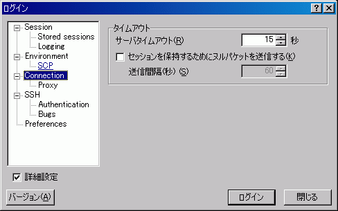 • Connection(接続)は、NAT機器内からアクセスする場合に、ある一定時間アイドルタイムが続くと切断されてしまう問題が発生するため、その場合のみ、「ヌルパケットを送信する」にチェックを入れます。そしてまぁ間隔は300〜600程度が妥当でしょう。