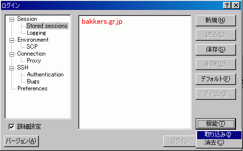 1. Stored sessions内の「機能」をクリックし、「取り込みを選択します。