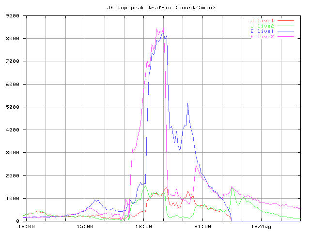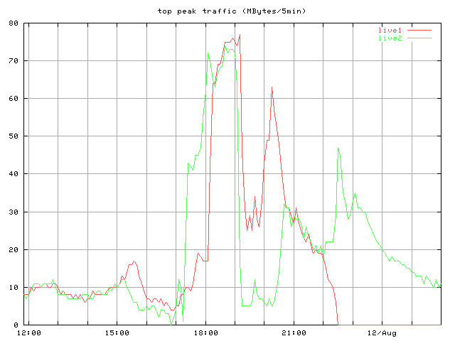 22:00以降の変化は、22:00ごろにDNSによるlive1,2への振り分けを