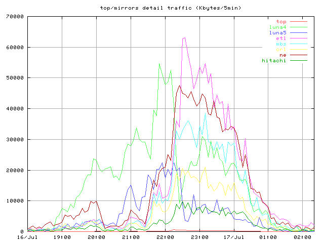 中継時間帯全体の 5 分ごとのバイト転送量。トップサーバと全ミラー。