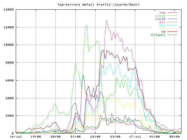 中継時間帯全体の 5 分ごとのヒット数。トップサーバと全ミラー。
